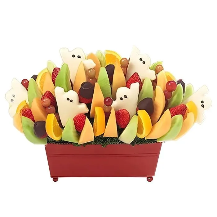 It's so fresh, it's scary! Enjoy a delicious Fruit Bouquet with fresh fruits in season and dipped strawberries and Spooky Pineapple dipped Ghosts!