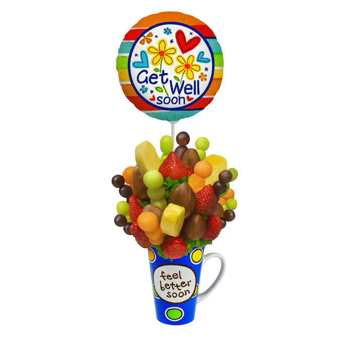 A lovely fruit arrangement consisting of pineapple, strawberries and much more custom made in a get well mug and attached with a get well balloon. The gift is destined to make someone Smile.