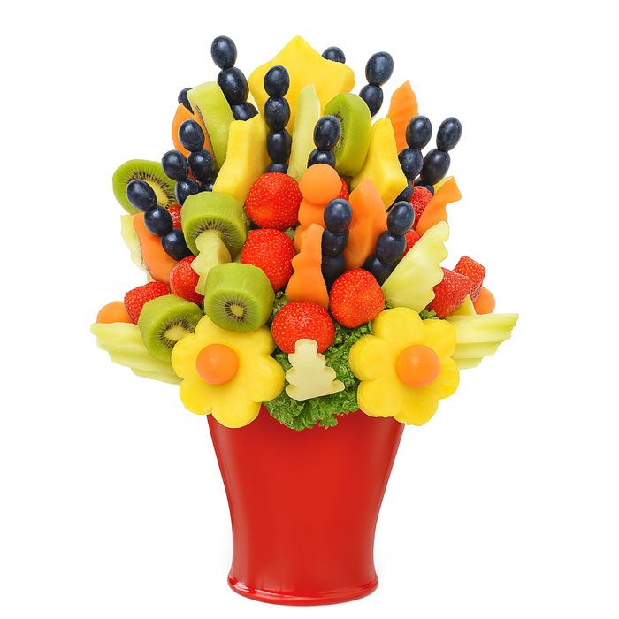 Sizzling juicy fruits bursting with tastebud delights. This edible fruit arrangement Includes juicy pineapple stars, cantaloupe melon, kiwi and much more.