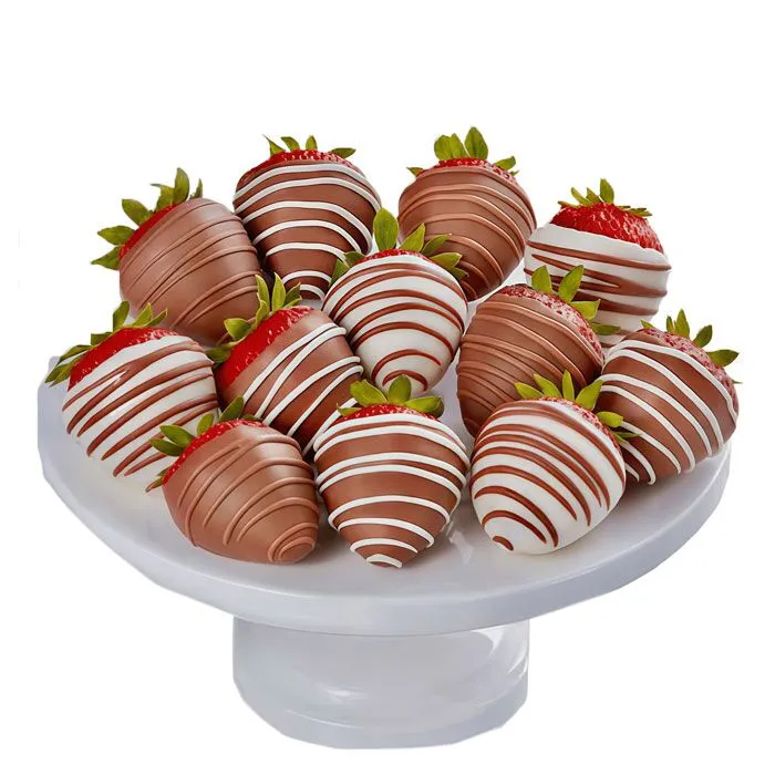 Fresh strawberries dipped in milk and white. Gourmet chocolate and decorated with chocolate drizzled over them. Not only do they have the WoW factor but they taste Devine too 🙂
