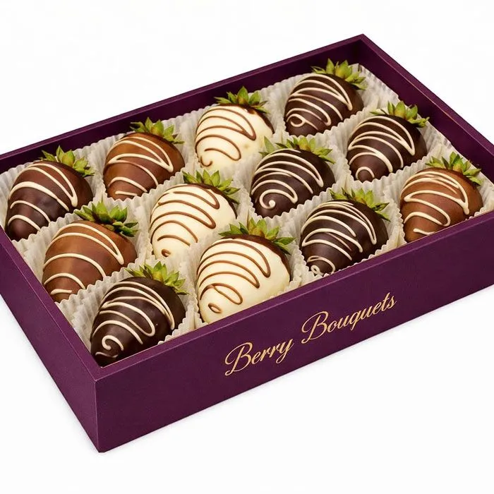 Fresh strawberries dipped in milk and white. Gourmet chocolate and decorated with chocolate drizzled over them. Not only do they have the WoW factor but they taste Devine too 🙂